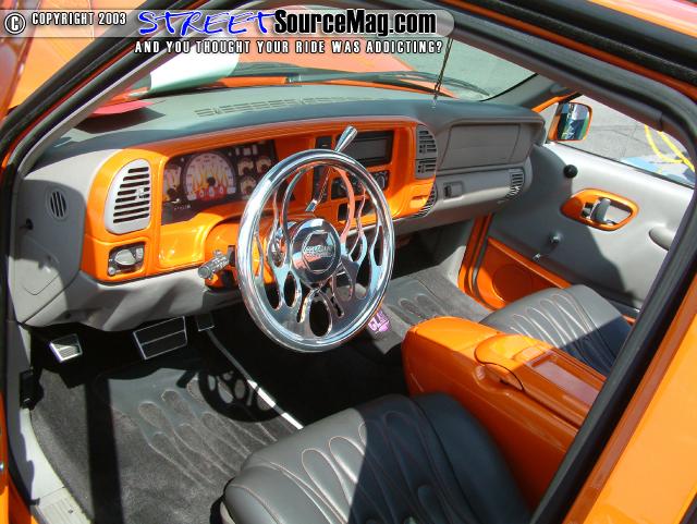 Charcoal grey leather with orange flame stitching, Painted console, Billet Accessories, Billet Steering Wheel, Various Painted Interior Pieces, and some suede accents.