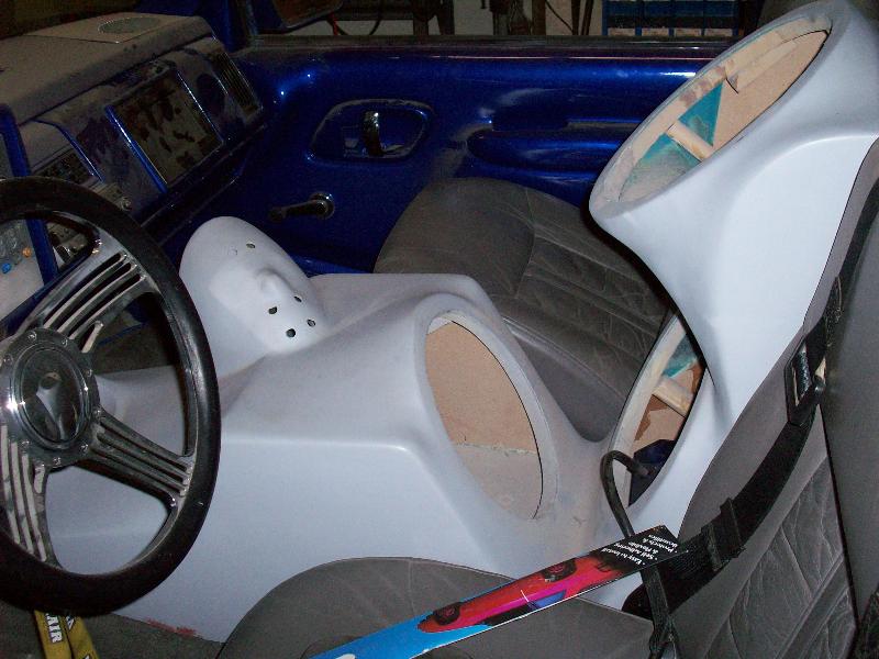 smoothed and painted dash, 95 door pannels, yukon plastics all smoothed and painted, grey leather buckets, and steering wheel, lots of billet, 7"screen in the glove box 6.5 screen in the headliner fiberglass box for the tree twelves and switches