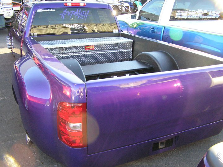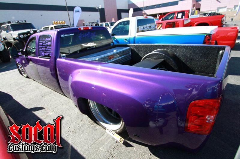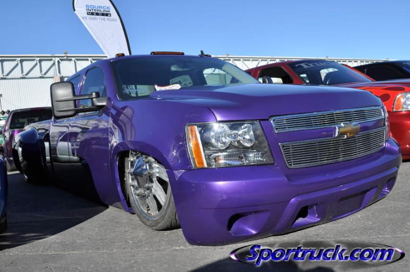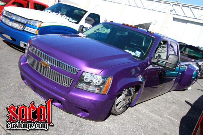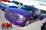 tahoe front end conversion body dropped fully shaved suicide rear doors huge rag top house of kolro pavo purple paint job custom hood 06 chevy hood bubble grafted into tahoe hood