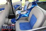Mike's specialty as the Owner of LB Threads then came into play. His crew custom built a new dash and wrapped it in Futura Textiles Spectrum Pearl Gray and Synergy Blue Suede. The front seats were cut down and reshaped. The new interior received Dakota Digital Gauges as well as Empire Motorsports a billet shifter, pedals, air conditioning cover, door handles, and air conditioning vents. The rear seats were tossed out and replaced by cut down Chevrolet S-10 seats.