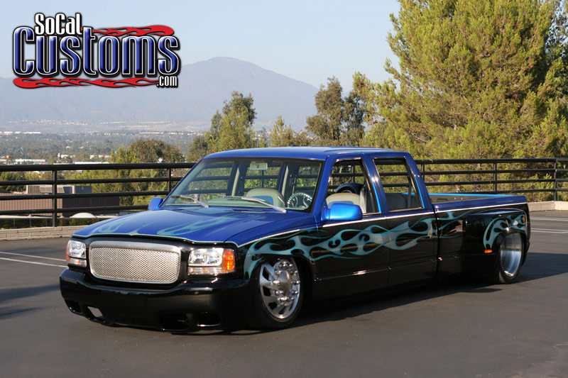 Knowing that a Crew Cab Dually has no business being so high off of the ground, Mike took the truck to the guys at GO-EZ Custom in Placentia, California. Just like their other truck, they wanted the Dually bagged at all four corners to bring it much closer to the concrete. In the front, the GO-EZ guys added 2600 pound air bags, Belltech drop spindles, Devious Customs lower control arms, and raised the front cross member. They then moved to the much larger task of laying out the rear. The rear suspension was taken out and was replaced by a set of 2800 pound air bags and a custom 4-link. The rear end was then narrowed to allow the wheels to tuck under the Dually fenders. To adjust the suspension, they installed two 3-gallon tanks, two ViAir 450 compressors, and hard air lines for air delivery.