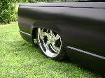 chrome front bumper w/recessed lic. plate, grant kustoms rollpan, and handle relocator. clear headlights, turn signals and corner lights and billet grill. shaved tailights with watsons streetworks leds. urethane black primer with tru blu pearl flames pinstripped in lime green