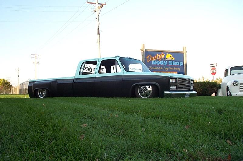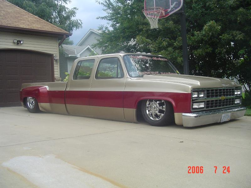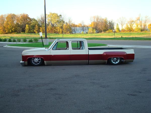 Shaved front and rear marker lights, door handles and key holes, wiper cowl, tail lights, tailgate, both gas doors, stake pockets, upper cab seems, drip rails, fire wall, tailgate and roll pan welded in. Rear flares are molded in. Suicide rear doors, rebuilt inside of bed with square tubing and smoothed it all out, body dropped.Cadillac Seville 3rd brake light, front inner fenders, cowl hood. Two tone Cashmere Biege and Red Fire paint. New suburban grill. Line-X spray-in bed liner