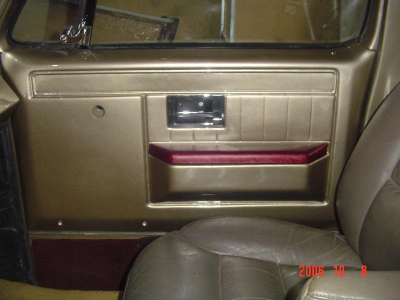 Painted headliner, door panels, and all of the pillar trim. Seats out of a 99 Tahoe with Katzkin covers, custom sheet metal dash with Auto Meter gauges. Lokar floor shifter. Flaming River stainless column. Custom center console and made kick panels and a few other fiberglass pieces