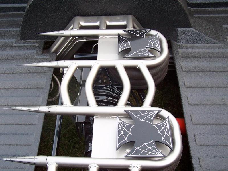 Modified Air Ride Tech. Cool Ride kit with 3600 pheonix bags. Rear parallel 4 link, 2" diameter bars. tripple convolute conitech bags 15" of usable stroke, rear bags mounted upside down so the air line moveswith rear axle, 1/2 parker electric valves, 2 custom painted viair 450 compressors. 3" stock floor body drop, Front frame section raised 1.5" for less ball joint binding, All 3x5 box tubing rear frame, Frame was sand blasted and painted pewter. Hard line stainless fuel, brake, and 1/2" air line. milled spikes in rear of bridge.
