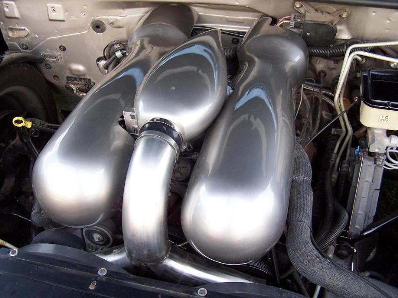 350 vortech, urethaned black, pulleys and brackets are black. flex-a-lite dual electric fans. custom stainless dual intake and intake housing. Hand fabbed engine covers shorty ceramic coated headers. Eng also lowered 2", hand fabed fuel cell rhino lined with stock fuel pump under bed, battery and charcoal box relocated under bed. Painted control arms, spindles ect. pewter