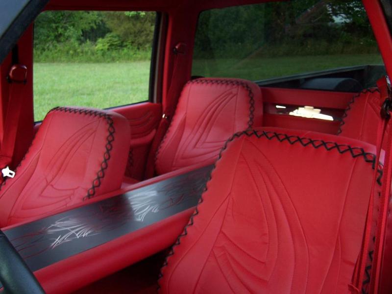 Custom after market streetrod buckets. Covered in red ultra leather and red perferated ultra leather with black leather football stitch, Floating center console with steel center satin black with red and black old school pinstriping. Billet botie strip inlay in rear panel below rear window, dash satin red with upholstered top cap, smoothed door panels hand made armrest hand made stainless trim, relocated window switches to hidden location, hand made kick panels, deleted e-brake pedal, also deleted sun visors and all oh shit handles, re spooled seatbelts in red, red ACC carpet, smoothed headliner also in red ultra leather. All interior work by Trent@ www.trentstrickupholstery.com Hand made steering wheel by myself hoop is 2.25" diameter tubing satin black pin striped and wrapped in leather.