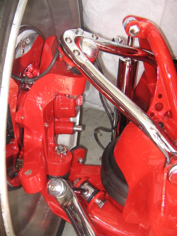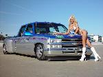 Body dropped 4inches by Robbie Taylor and Mike Barcia and layed out on 22.5 semi wheels, The front has djm 3" drop spindles, custom built shock hoops, has been modified to lay out on the 22's custom built sway bar mount, notched for the tie rod ends and the front and Rear frame has been smoothed out and painted, slam specialty re8 bags everything is powdercoated or chromed by Advanced Plating the rear has a custom 4 link with the bags on the bars, the rear end has been shortened 8 inches to tuck 4 22.5 x 8.25 wheels, step notched rear frame rails , 3 5 gallon stainless steel tanks, 4 viair 480c compressors, smc valves, all suspension work has been performed by Adam Hartman at mechanical advantage and with help by Mike Barcia