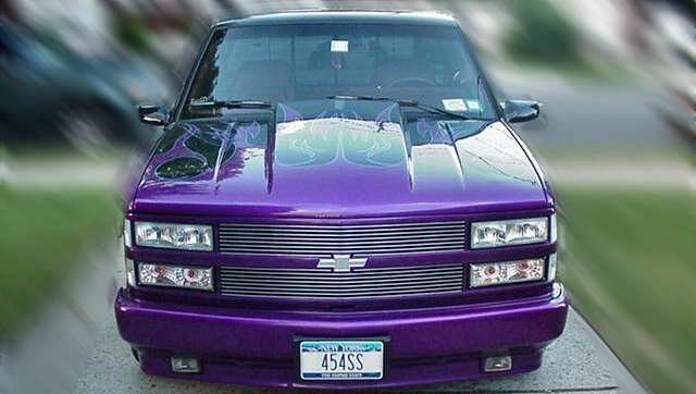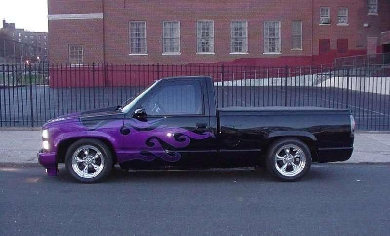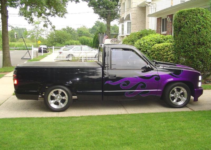Harwood cowl induction hood,Custom Classic steel molded in rollpan , tinted windows, Tekstyle soft bed cover, Bedrug,Trenz polished billet grill and bowtie,clear corners,diamond back headlights and park lights, TYC black taillights. factory side mouldings, decals,tailgate handle and stake pockets were shaved. House of Kolor Passion purple tribal flames with sky blue outline.