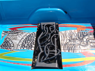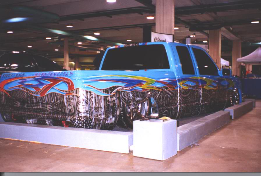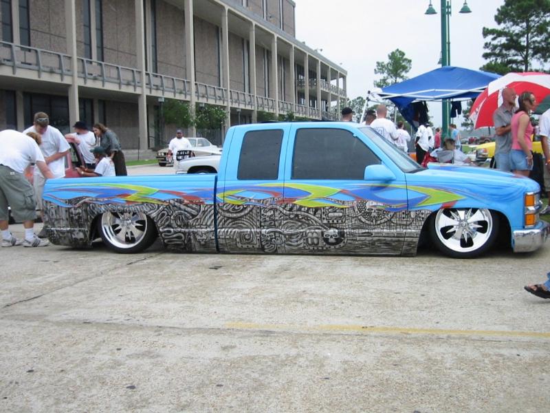 custom paint with graphics,shaved handles, shaved 3rd brake light, shaved antenna, shaved gas door, shaved tail lights and tailgate handle, molded in rear end, supra tail lights, frenched license plate, sliding rag, billet grille and bumper, cowl hood, smoothed bed,etc
