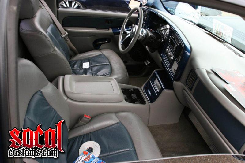 Gray Katzkin seats with blue inlays and blue inlays in the door panels, Budnik Trilogy steering wheel with LeCarra adapter, billet shifter, ///RA billet rearview mirror, heater box cover, dash kit, pedals, and door sill plates. full length center console out of '02 Tahoe. Dakota Digital Gauges for the air ride, Silver face Escalade gauges.