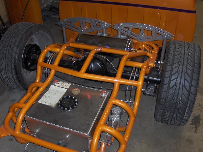 Full round tube backhalf,smoothed and painted orange, fuel cell, 2 viairs,cantilever setup,slam bags, 2 link, all done by me.