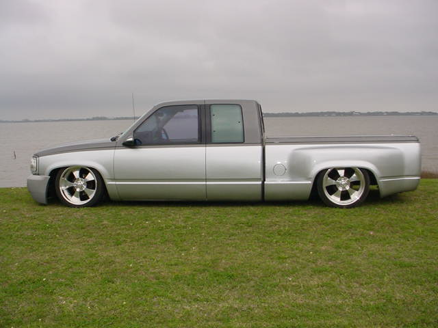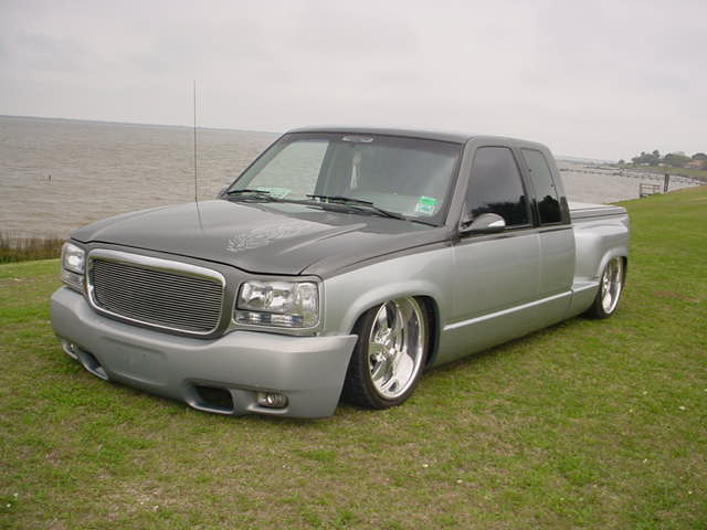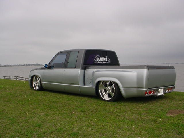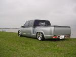 Caddy front clip, shaved door and tailgate handles, shaved 3rd brake light relocated to tailgate bodyline with 24 inch led, shaved taillights and rear step and front step pads, custom rollpan filled with modified 97 integra tails, speed glo mirrors sprayed platinum and silver bunch of scratches and dings