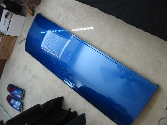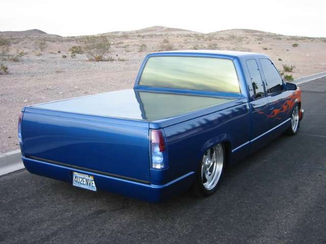 House of Kolor paint, blue base coat and orange flames sprayed by Mike at Unique R.V. and Autoworks. Shaved tailgate handle, third brake light, Sir Michaels rollpan, Street Scene mirrors