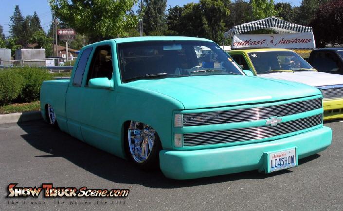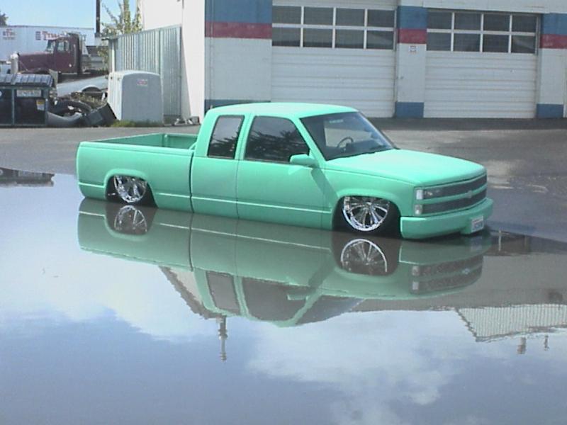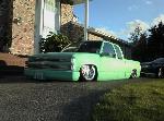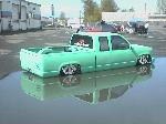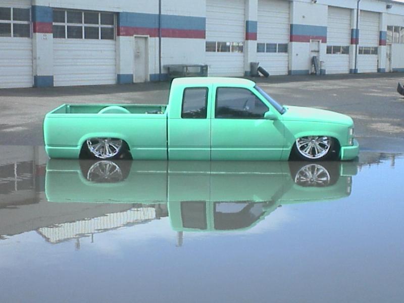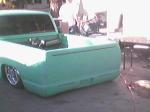 Cali-combo completely shaving taillights, tailgate and rollpan. also shaved gastank door, rocker pannels, stake-post holes, doorhandles, and antenna, frenched license plate box 58" flush mount LED third brake light + LED brake, blinker, and backup light combo down low, phantom billet grill, and smooth steel bumper with frenched license plate box. Smothered in green primer
