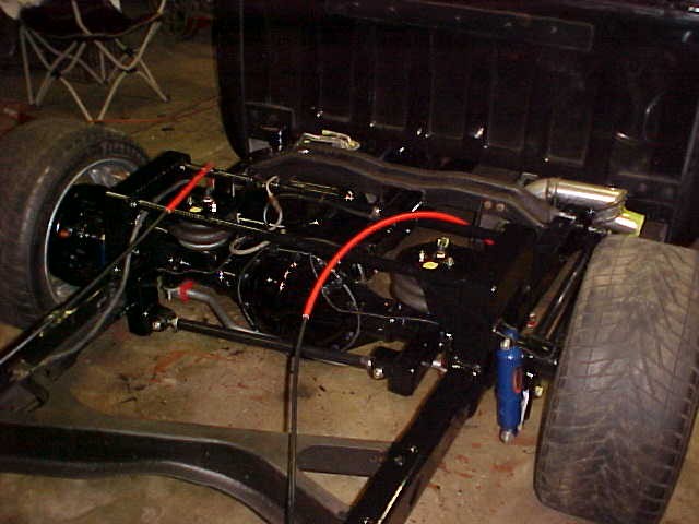 in pictures: bel-tech 7/9 drop. in process of 8.5" step notch, full air ride suspension, 4-link parallel bar rear suspension. viair compressor, 6gal 10port air tank, 3/8" air lines, 4qty big red anodized air valves, polished aluminum 4-way switch panel, gray face analog air gauges, all from air ride technologies. I am trying to get this truck to sit as low as possible without a body drop!