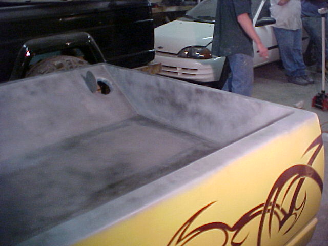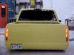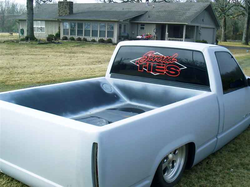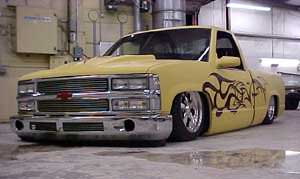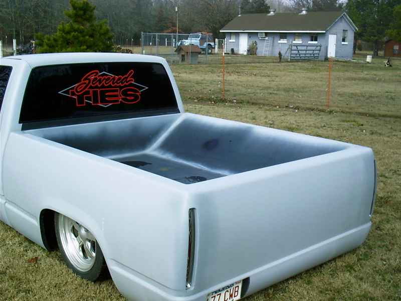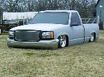 billet bumper and grille, clear corners, cowl hood, shaved ass end, shaved stake pockets,shaved door handles, shaved third brake light, shaved antenna, shaved gas door,caddy tail lights and custom molded bed,oh yeah its body dropped 3"