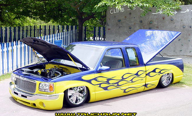 shaved body seams, antenna, doorhandles, tailgate handle, tailgate shaved shut, gas tank, molded rollpan, cadillac taillights, painted blue and yellow with blue flames.