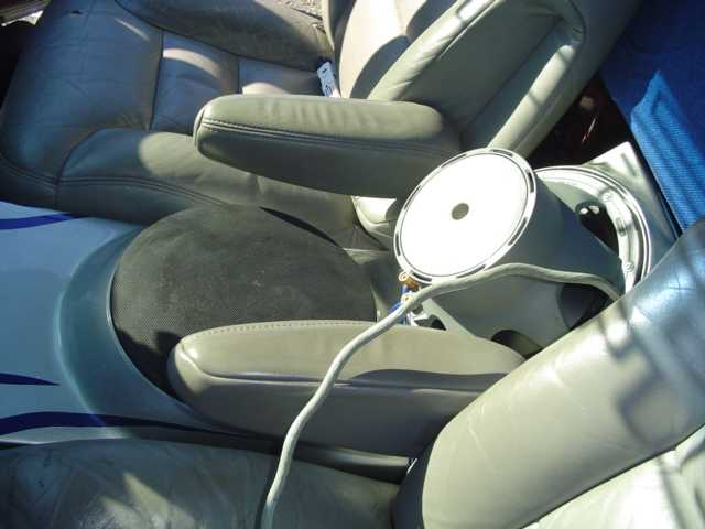 mostly wrapped in tweed. All panels, door panels and head liner. Dash and seats are next on the list. Door panels done by MR. SCRAPE CUSTOMS. Fiberglass console between the Tahoe bucket seats. The console has 2 TV's in it and 2 Boston Pro 10's in it and also has a Playstation 2 molded in.