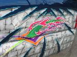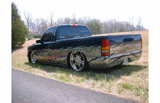Indigo blue with House of Kolor graphics. Suburban front grill shell with billet insert, clears all around, shaved t-gate handle, sir micheals steel roll pan, Gaylords tonneau, bumper color matched with billet insert with chrome valance with billet insert