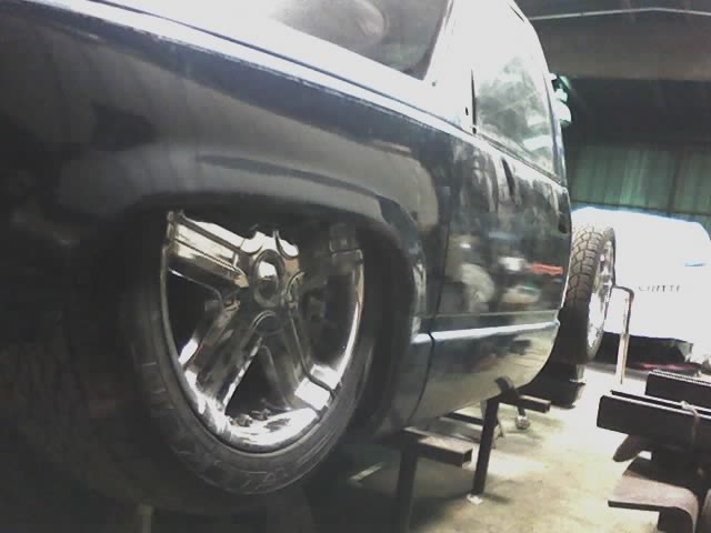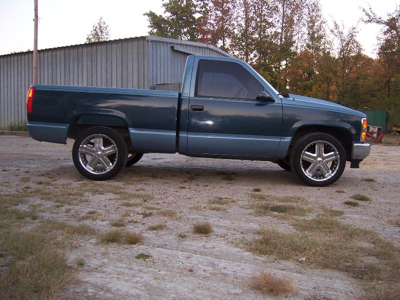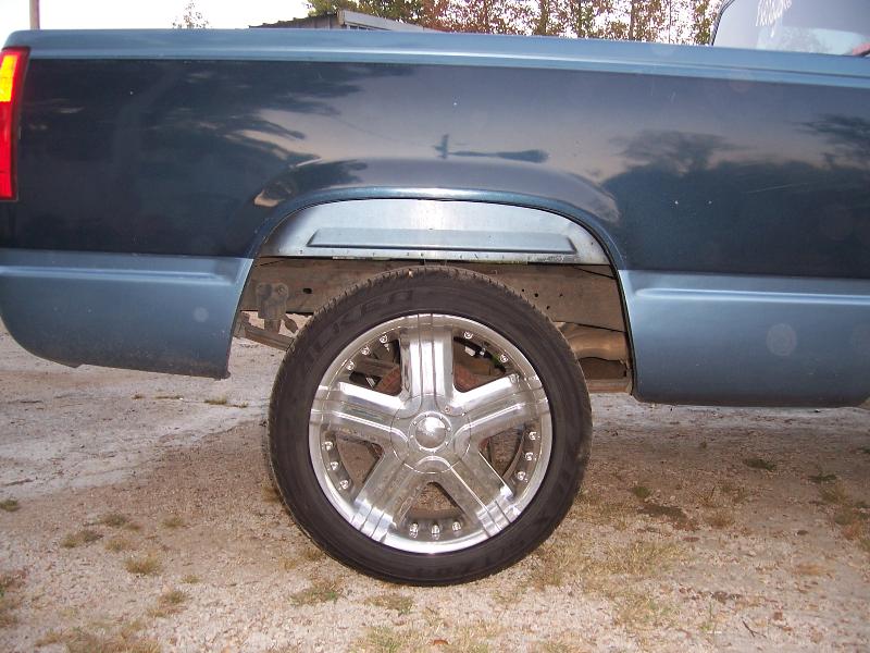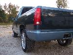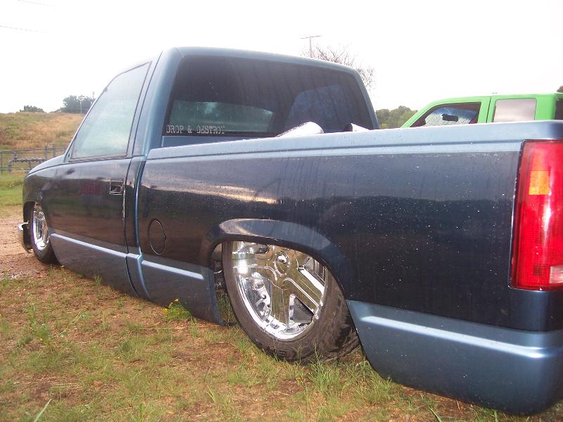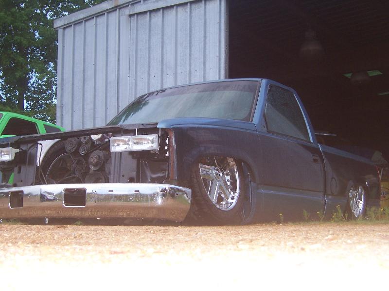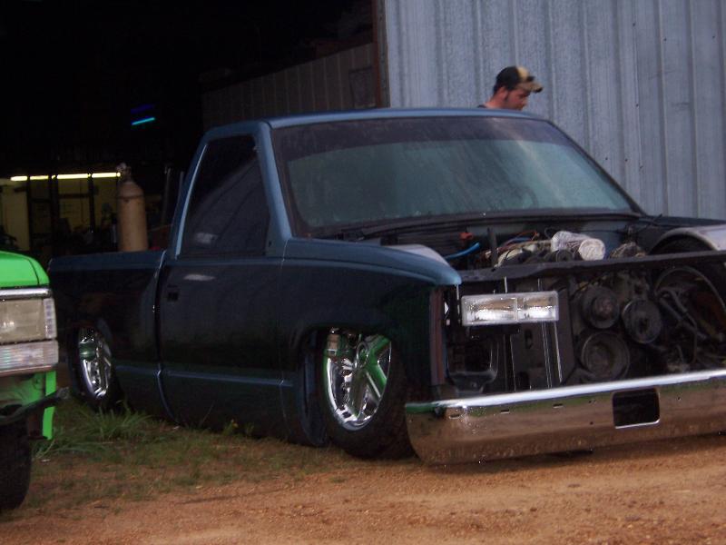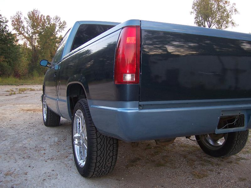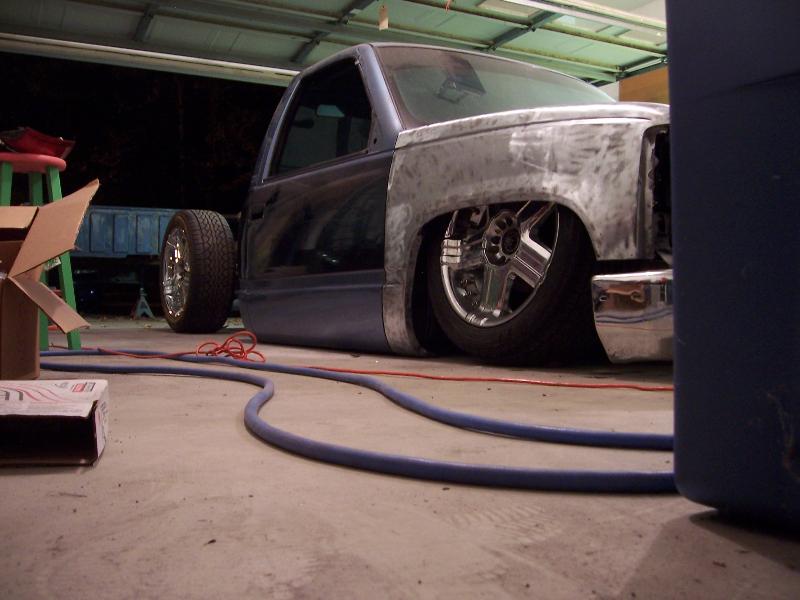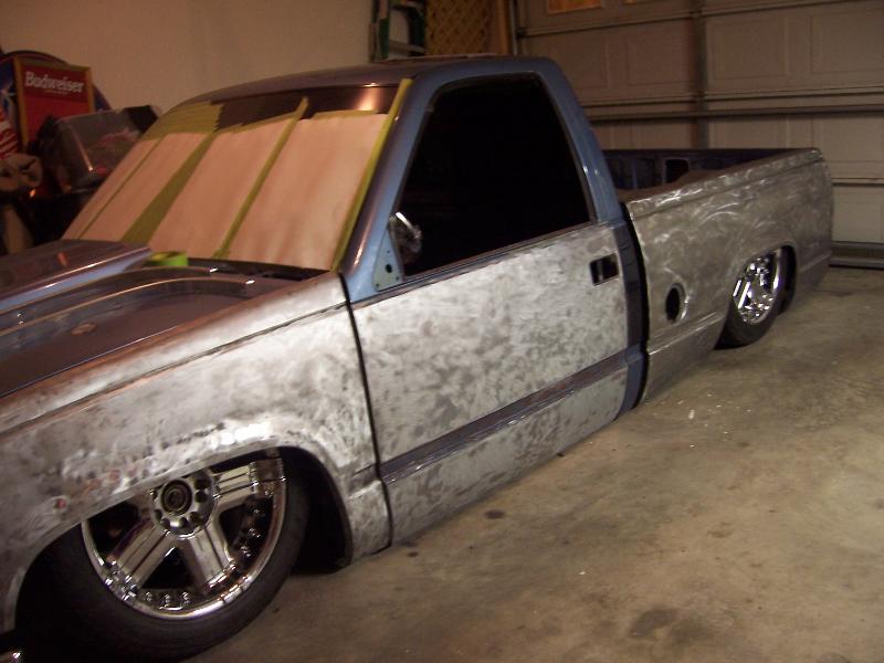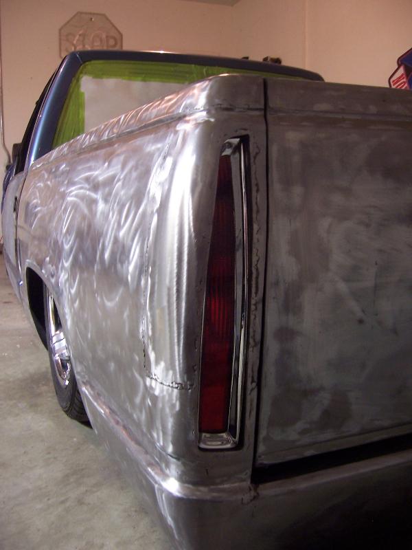 Some ugly old paint that keeps getting more beat up everyday. Sectioned rockers one inch, custom wheel tubs under the hood and in the bed, stock floor bed(well kind of), Bare metal, soon? 99 Deville tail lights, one suicide door (so far).