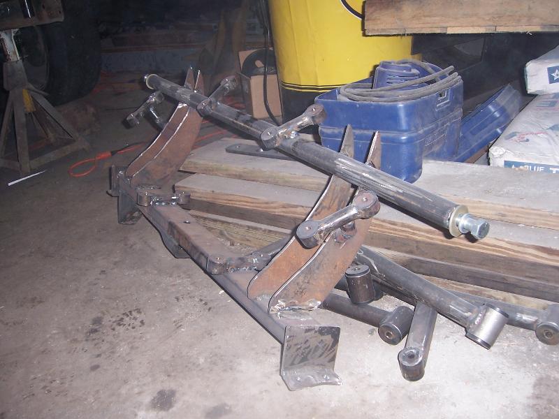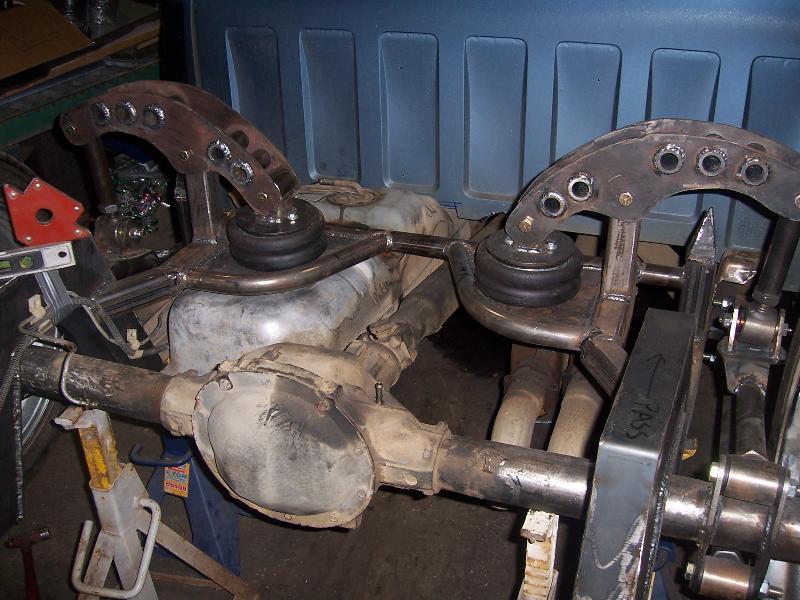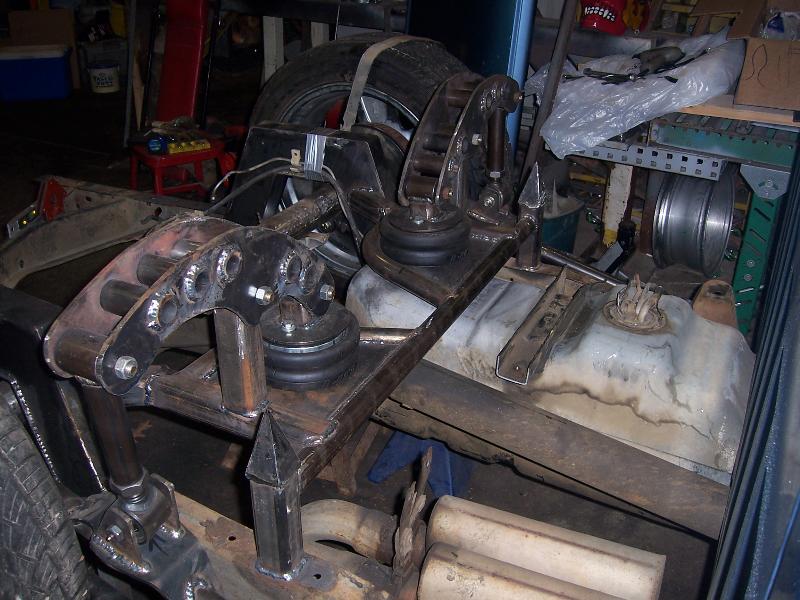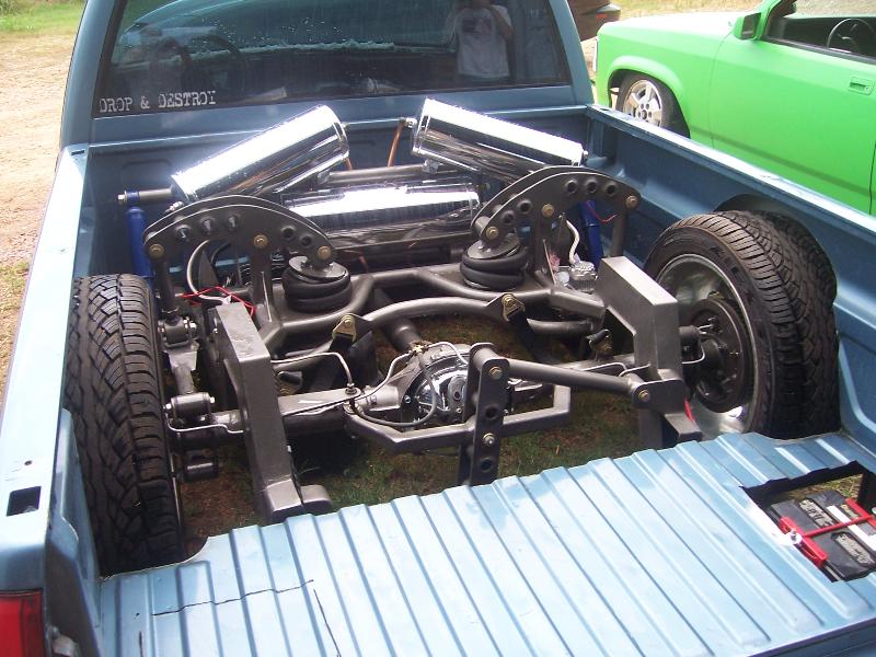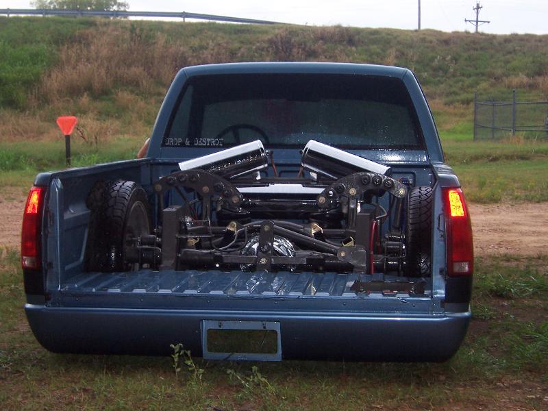 Cantilever rear setup over a raised stock tank, SD parallel 4-link 35" bars, 10" notch, gen 2 bridge, Airlift bags, 2 Viair 380's, 2 SMC watertraps, 8 SMC half-inch valves, 5 gallon 9 port chrome tank, two chrome 3 gallon's, ten switches, and a custom built watt's link (good for over a foot of lift). Monroe shocks all the way around. 20 inch Crow limit straps to limit lift to 18 inches.