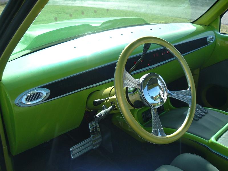 teladaga steering wheel, chrome column kit, chrome flamed mirror and pedals, gray leather,SWADE and alligator seats, smooth dash with dekota digital gauges inset and centered behind a covered screen (hidden) until turned on