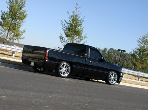Stull Billet Inserts, Tahoe grille & upper bumper cap, Painted bowtie, Painted Ventshades, Blacked Out Projector Headlights, Blacked Out Corners, Xenon super whites, Trailmaster air-dam, 02'HD hood, Shaved molding & emblems, Billet antenna, SS wiper cowl, SS mirrors, Custom painted calipers, Custom Tinted 03' Tails, Snuglid, Bedrug, Sir Michaels rollpan, Billet Lic. frame. Paint work under hood.