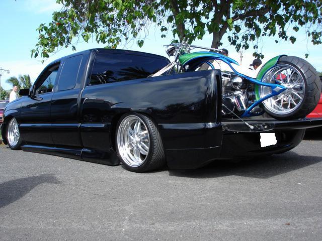 2002 Cadillac Escalade front clip, Trenz Billet grille, Frenched Cadillac taillights, LED third brake light, 35 x 25 electric sunroof, Xenon body kit, Xenon rollpan, Gaylord X-2000 bedover, Street Scene sports mirrors, Street Scene wiper cowl, Shaved door handles, Shaved gas tank cover, Shaved tailgate handle