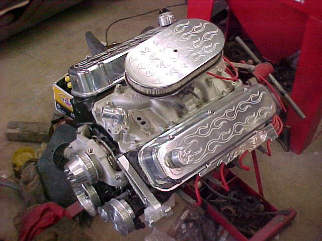Fuel injected 454, all march pulleys and brackets, flamed billet valve covers, chrome alt., Soon to be twin supercharged, camed, edelbrock intake, milodon high volume oil pan, high volume oil pump. 6 speed trans out of 97 camaro, custom built bellhousing,