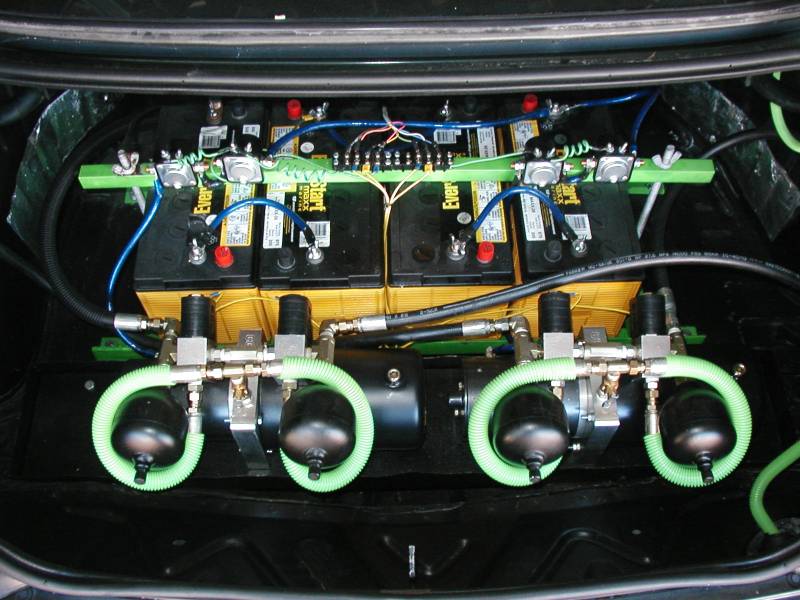 Custom struts by DIABLO DESIGNS were made to fit 8" cylinders all the way around,also custom cups were made to fit the power balls. Wires and hydros were installed by Beater Nick of BACKYARD KUSTOM of MICHIGAN. HE did the sweet set up. and it lays on the exhaust system on the ground.(front and all the way back) AND IT DRAGGS! sick and nasty!