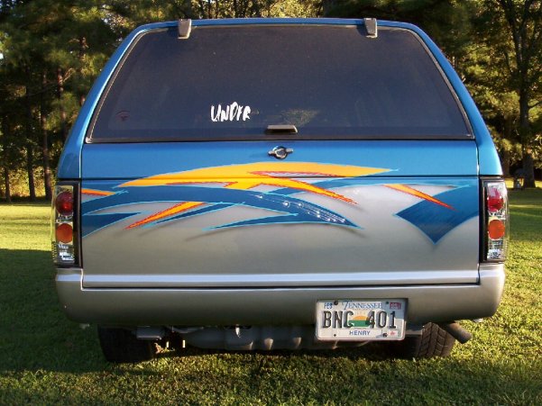metallic iridescent blue, " " silver and orange.....airbrushed