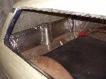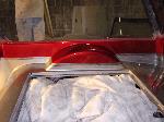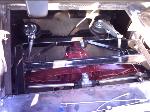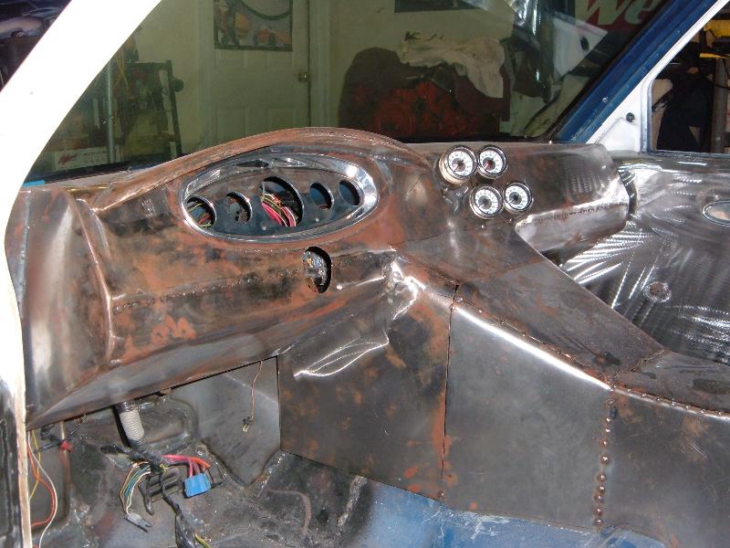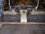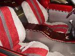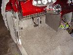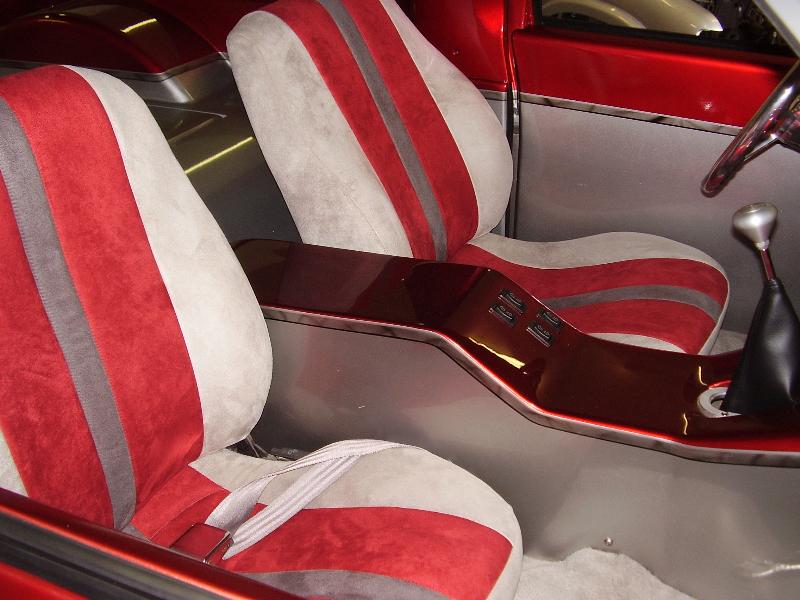 Billet Specialties steering column. Full billet Billet Specialties Vintec steering wheel. Custom sheetmetal dash and console. Lokar cluster, Moon Eyes Gauges. Easy Street Air Gauges. Metal door panels with Lokar door handles. Lokar shifter. Lokar Eliminator Floor Mount Gas Pedal, with matching Lokar Brake Pedal Pad, and Lokar Dimmer Switch Cover. Sheet metal interior done by sean@ seriously insane auto concepts. All paint work done by Donny Schreiner of MaxxMuscle Custom Cycle Painting. Julianos airplane style lap belts. Seats and headliner covered by David Corn at Pro Stitch Custom Interiors. Seats covered in red and grey suede with a dark grey strip in the middle to match the paint scheme. Silver carpet also done by David Corn.