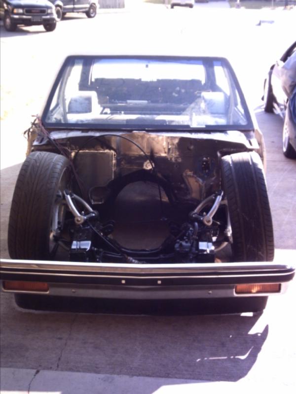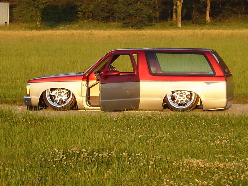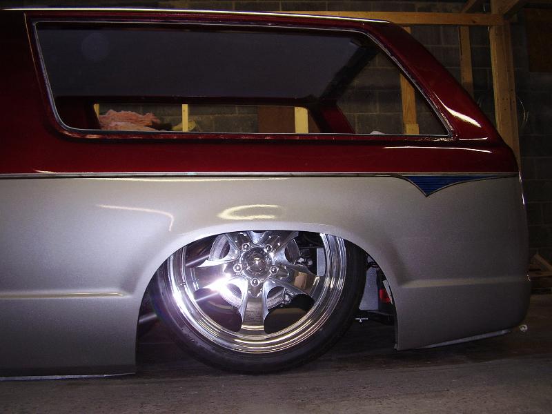 4 1/2" bodydrop. Barnyard upper and lower control arms painted silver. 2500's up front with spindles (All suspension and brakes painted to match).Back-half rear frame with 1990 corvette irs painted candy red(narowed 9"). Cantilever with 2600 lb bags. work done by sean @ seriously insane auto concepts. All paint work done by Donny Schreiner at MaxxMuscle Custom Cycle Painting.