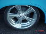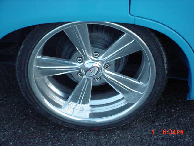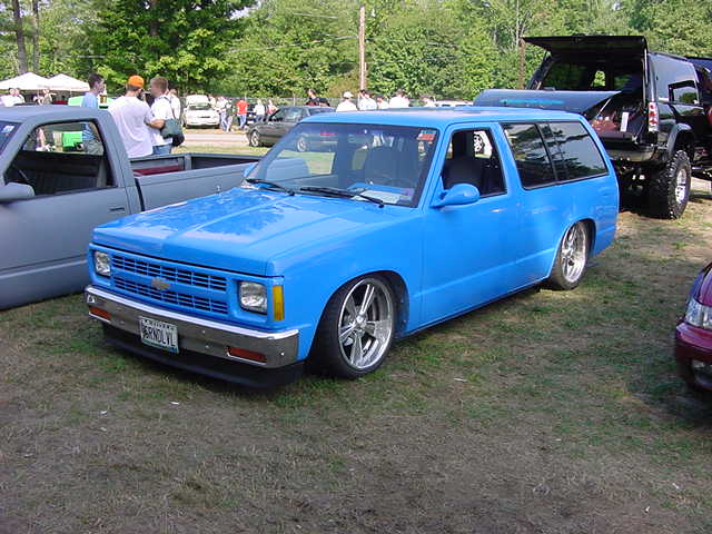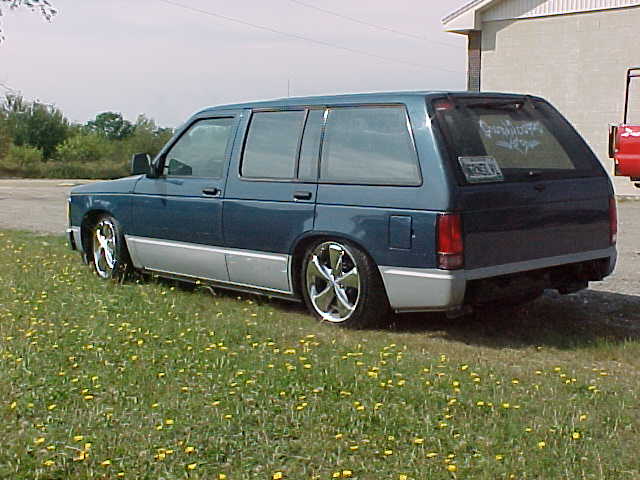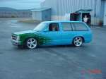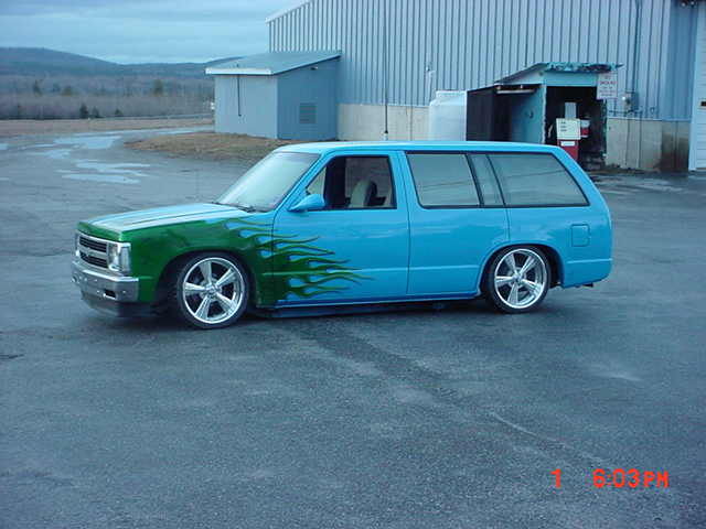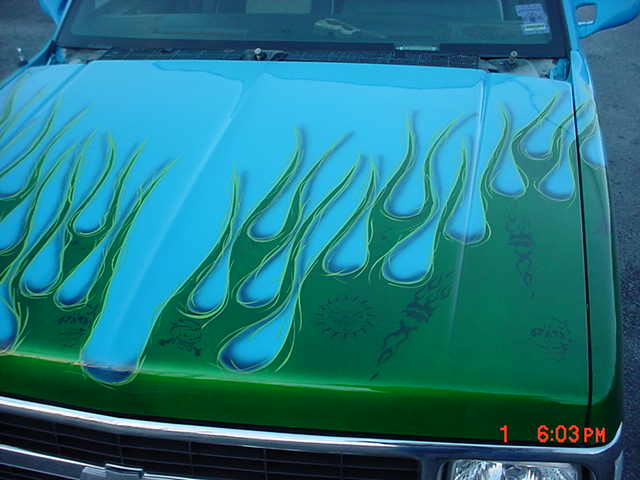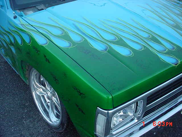 shaved tail lights l.e.d. lights in smooth f.b.i. roll pan. licence plate box frenched into tail gate . shaved roof rack, door handles,body line....... fresh ford grabber blue paint with HOK organic green candy flames and skulls....