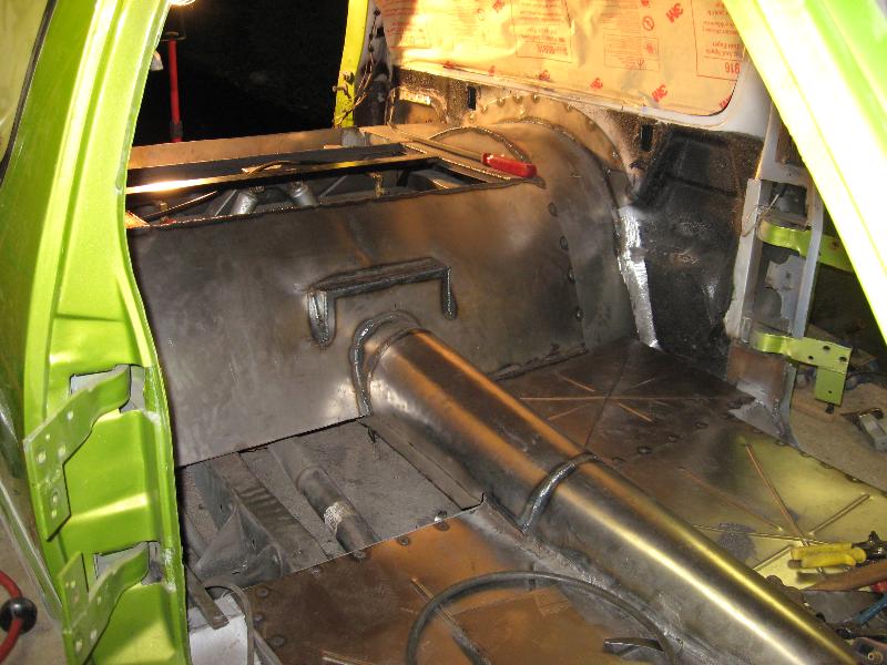 55 chevy dash, bench seat with tuck and roll, chrome steering wheel, autometer artic white guages, complete from front to back bead rolled floor hand built, for a traditional body drop, with only losing 3 inches of head room