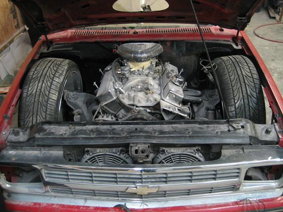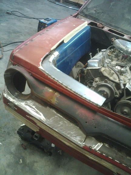 56 ford grill shorten 6" an short front brumper, stock outer fenders for the inner fenders, an shaved azz end