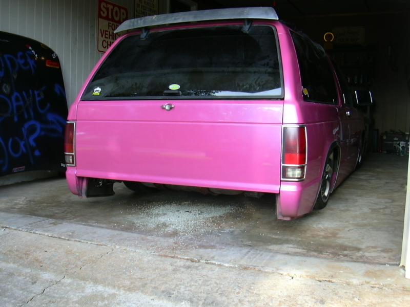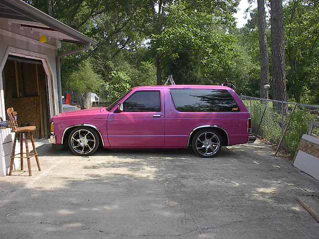 Pepto Bismol pink (NO I'M NOT GAY) with a blue pearl 93 chrome grill w/billet insert, a shaved roof rack, & emblems COMPLETE SHAVE COMING SOON DID I MENTION THIS IS UNDER RECONSTRUCTION