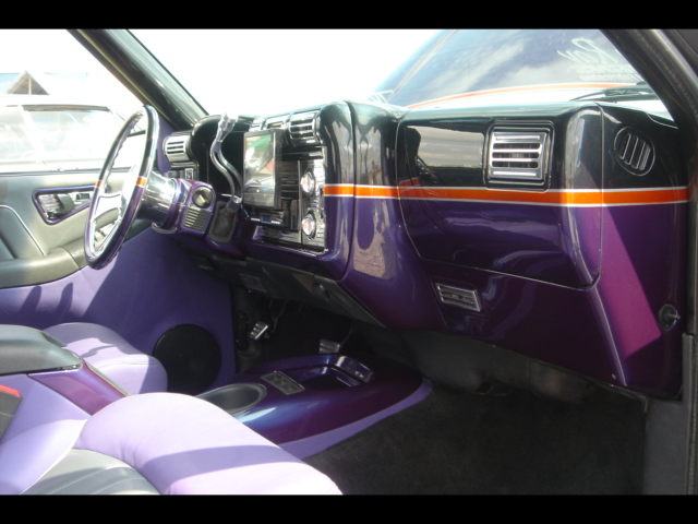 painted dash, billet inserts, billet steering wheel, painted and vinyl wrapped interior panels, vinyl and leather wrapped seats, fiberglass stereo enclosure and amp rack
