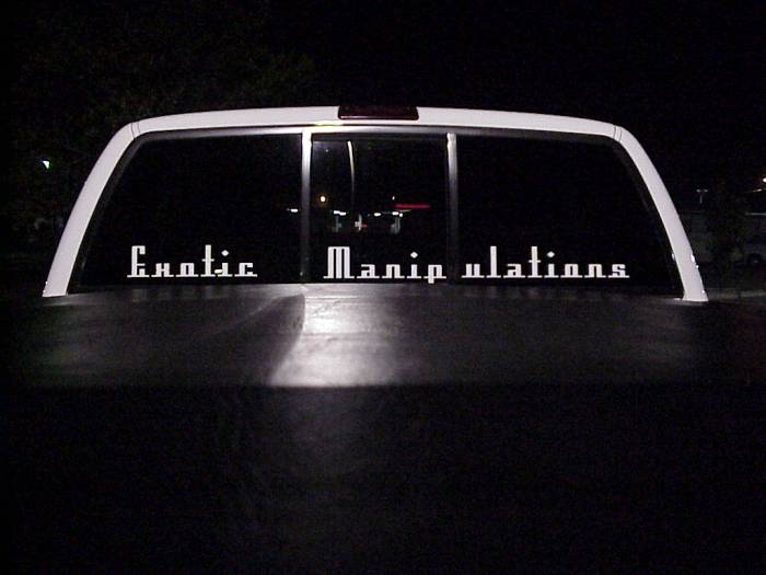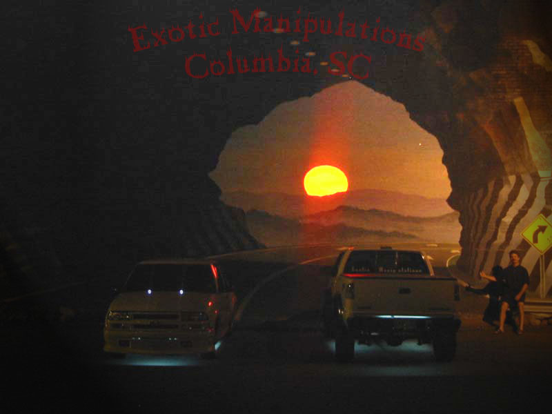 BMW style projector headlights, euro wipers, Exotic decal, blacked out windows, toneau cover, blue powder coat calipers, clear corners, clear brake lights, flame 3rd brake light cover, white APC washer lights, white underbody neons, shaved emblems, BedRug bed carpet, Street Scene custom grill, Street Scene front valance, billet chevy bowtie, rollpan with hidden hitch and flip up license plate