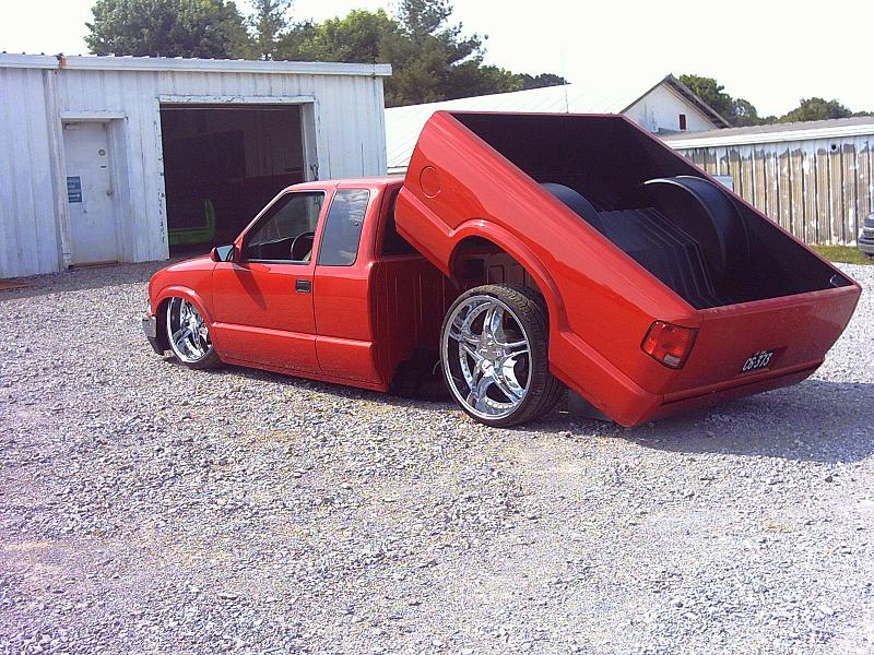 devious customs under bed mounted fuel cell relocated to rear of truck, suicide doors carrier bearing cross-member, devious trany crossmember, AEM intake, electric fan, yellow top optima