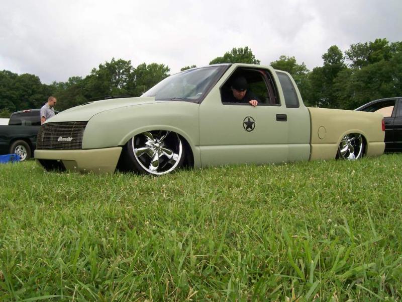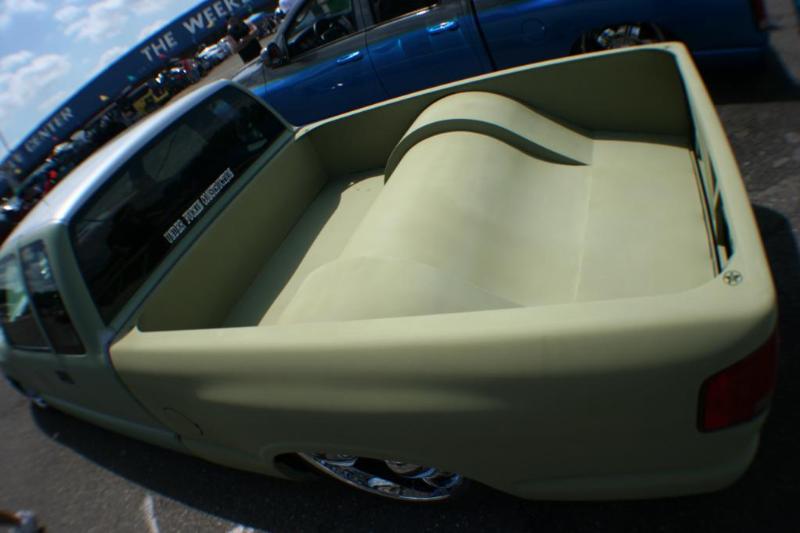 shaved side mirrors, phantom grille, grant kustoms front bumper, isuzu fenders w/ shaved corners, sheet metal bed with tear drop tubs,one off gussets by MMW at all four corners,and a smooth grant kustoms skin