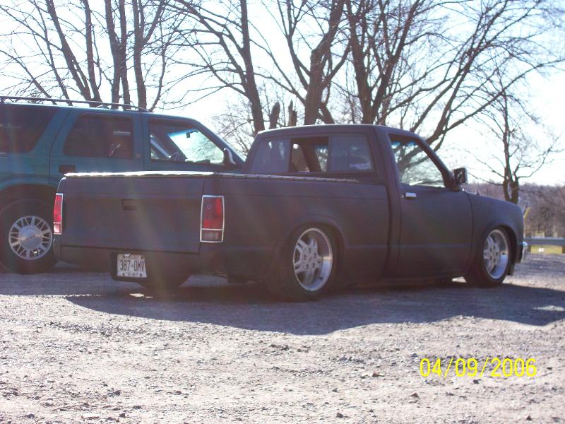 rear rollpan, changed to chrome mirrors, black front bumper with recessed crooked license plate, custom mounted fog lights, shaved all bodyside mouldings, extang tonneau cover, swapped to a '91 Chevy grille with billet bowtie and lookalike billet grille insert, clear corner lights, clear bumper lights, John Deere Blitz Black paint, in process of shaving body lines, custom hood with hood scoops