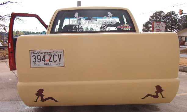 Bodydrop, cali-Combo w/ frenched plate, door handles, third brakelight, taillights, and antenna shaved, custom built LED trucker girl taillights(fabricated by SuperD), chrome motorcycle pop-up gas door, 2" cowl hood, 98 S10 chrome bumper/black lower valence, sheetmetal bed w/ radiused rear corners, full beige primer, all done by Endless Fabrications Inc. in Dallas, Georgia--(678)-758-2563