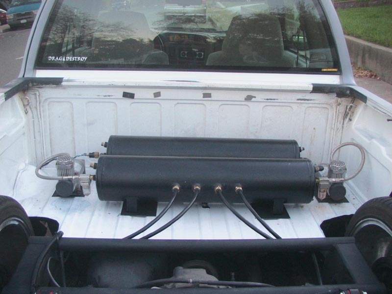 Bag on bar cando 4 link, doetch tech shocks in rear. Art upper and lower control arms, monroe shocks in front. Slams all around 6" in front 7" in back. 7 gallon tank under bed with (2) viair 400's. Soon to be Bio-built 3 1/2" drop spindles and Bio/Twisted minis Control arms with uniballs. Also soon to be Twisted Minis backhalf with 1-off rear suspension, and Bilstein shocks all around.
