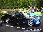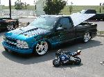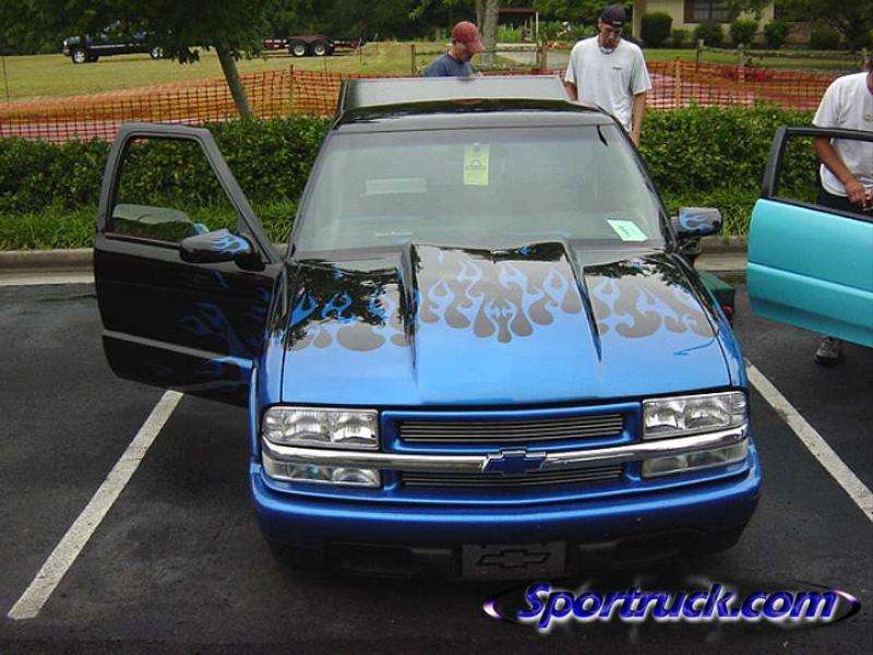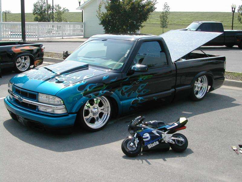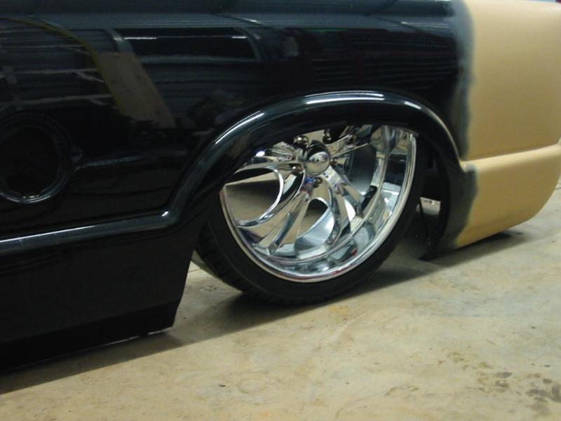 Shaved doors,antenna, hood pissers, full skin in back w/ 2 14" LED lights. Painted black w/ corvette blue flames and silver highlights.Shaved gas door and 3rd brake light