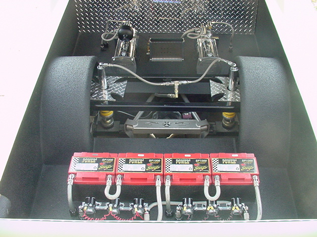 BodyDropped 4", 2 pump 2 dump prohopper hydraulic setup, all chrome pumps and dump bodies, all chrome fittings, 4 Stinger Dry Cell Deep Cycle batteries, all platinum connectors from stinger. Custom Made 4 link, maltese cross bridge plates, 6inch cylinders in front, 10inch in the back, Smoothed frame also in primer now, Frame is now painted all up ready to go.