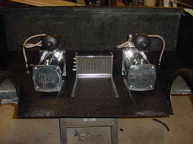 7" Pioneer In-dash motorized monitor with dvd player. DEH-P90HDD cd player with 10gig hard drive for un-limited music, and 13 band eq, 4" component set in the dash, 8" kicker resolution mid bass fiberglassed in the doors, havnet decided on subs yet, Complete Dolby 5.1 Setup with the AVH brain for the in-dash unit. 0gauge power with stinger digital distrobution to 4 gauge, all platinum terminals and connectors. 200amp high output alternator.