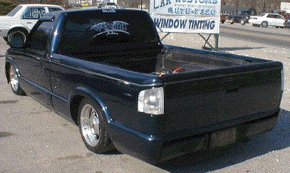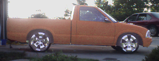 4.3 V6 Vortec TBI (now blown up). Shaved heads, bored over 30thousandths, ported and polished, with larger injectors. 8.5mm Plug wires, Boss Platnuim 4 Prong Plugs. Electric fan. 2 1/2inch exhaust pipe ran to a 3Aracing dual outlet polished muffler. Automatic transmission rebuilt with stall and shift kit. Painted acc. Aegean Blue and Pure White. Had to remove heat, air condition, ABS system, wiper motor, cruise control, belt driven fan, and rerun all wires for the body drop to snugly tuck the 20''s in the front. 4.3''s are fun. Droppin in a fully built 350 LT1 (or LS1)Corvette engine, equipped with twin turbo. And a full corvette driveline with disc brake rear end.