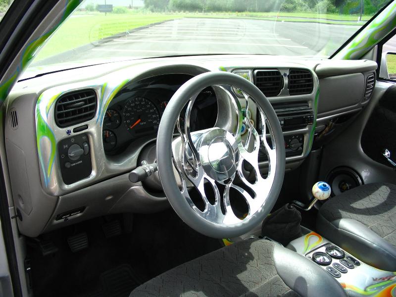 Smoothed and Painted Plastics With Some Murals, Custom Center Console and Shifter, FiberGlassed HeadLiner, Trenz RearView, and Colorado Customs Steering Wheel.